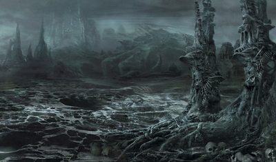 The morphic nature of the Shadowfell could produce strange effects, mainly in areas like the Black Rift that were especially morphic,[24] and with events that had a particular affinity with the plane, like death. For example, in the Black Rift alone, a pile of bodies caused more skeletons to appear, until there were thousands.[25] More bizarre were the strange biers upon which dead bodies spontaneously appeared, apparently drawn from wherever they rested, anywhere in existence, only to disappear after a few seconds, presumably to wherever they'd come from.[26] Stalactites in a cave dripped ephemeral shadowstuff, which was reabsorbed into the plane rather than form a puddle. Even common mushrooms bore realistic humanoid faces, capable of twitching or blinking.[27] More significantly, forests of grasping tendrils sprouted from some surfaces and reached for passersby, similar to the black tentacles spell.[26]